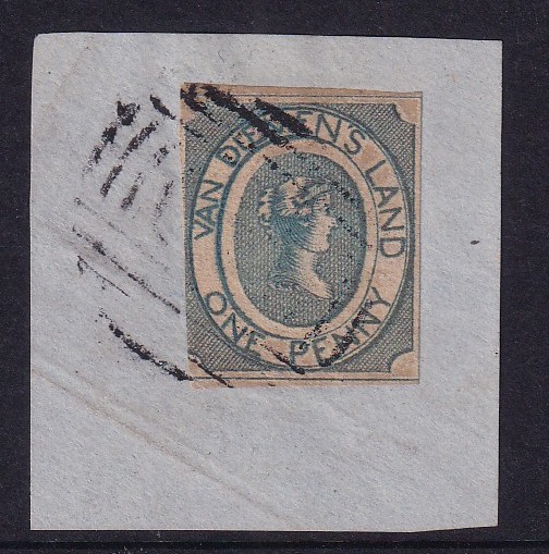 TAS 1853 1D BLUE YELLOWISH PAPER SG2 ON PIECE. 2½ MARGINS BUT STILL FINE AND RARE